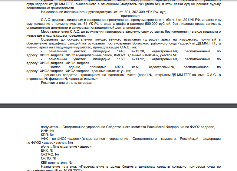 | Судебный процесс особо тяжких преступлений ст. 291-290 УК РФ. группой лиц по предварительному сговору или организованной группой; вымогательство взятки в крупном размере | от 200 тыс. |